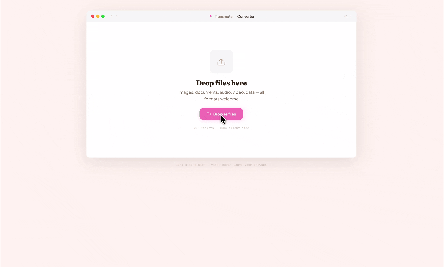 TransmuteOpen ConverterDrop images, docs, audio, video, or data files β get instant conversions right in your browser. No uploads. No accounts. No limits. Open source